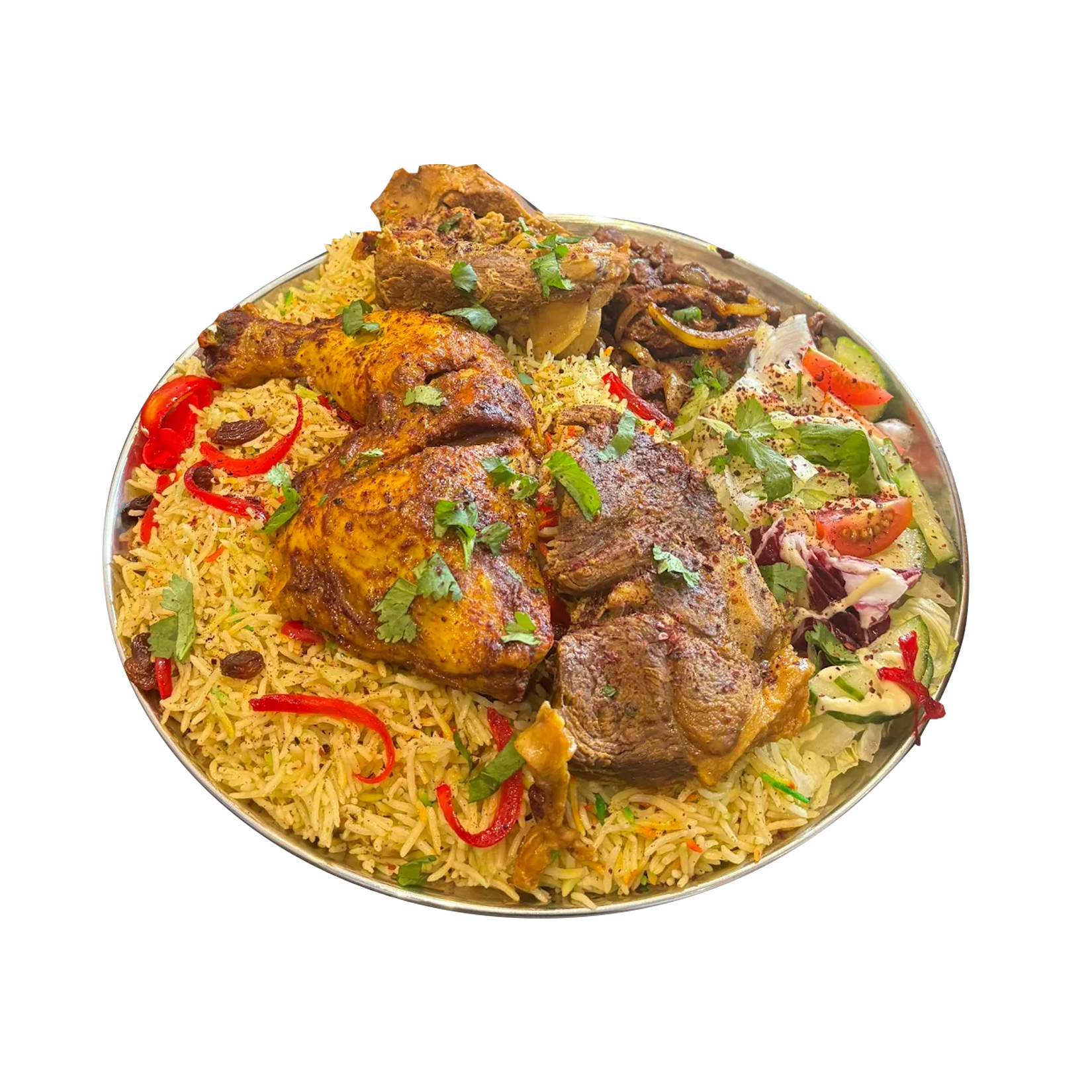Served with mini Lamb Shoulder, 2 Rice, 1 Pasta, 2 Chicken Leg Pieces and choice of Beef Steak or Chicken Steak or Suqaaar.